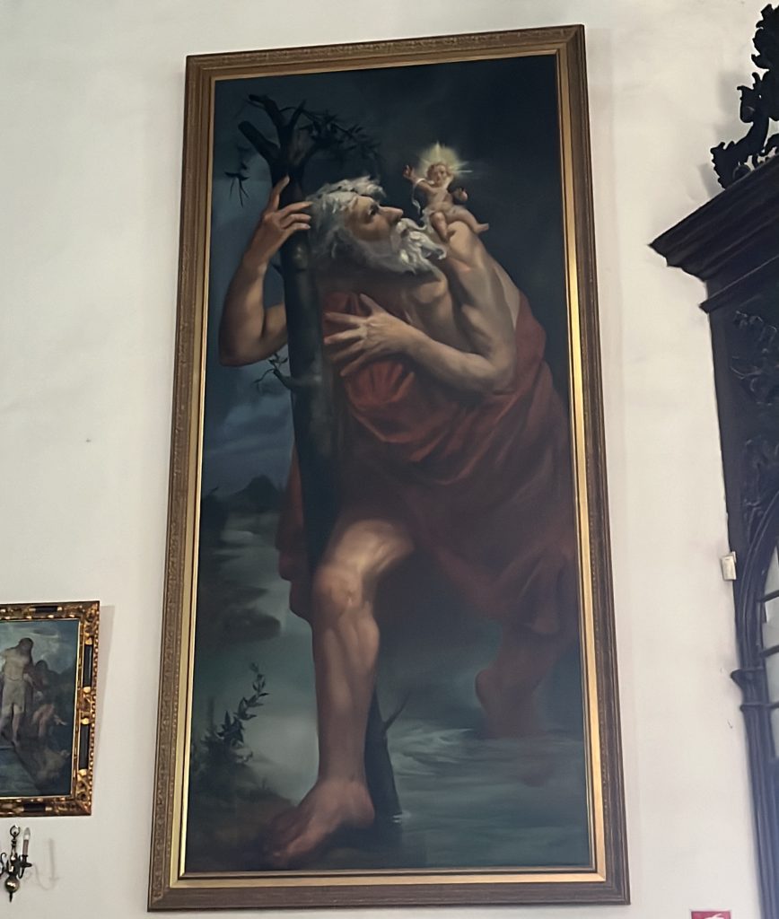 En la iglesia de El Salvador, en Santa Cruz de La Palma, hay un cuadro monumental de San Cristóbal que siempre me ha detenido. El gigante, apoyado en un tronco descomunal, atraviesa un río llevando al Niño Jesús sobre los hombros.
